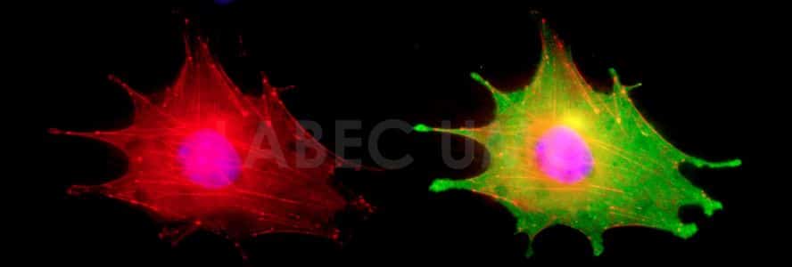 Figura 1: Microscopia de fluorescência de célula de melanoma murino (B16F10-Nex2) fixada, permeabilizada e marcada com DAPI que cora o núcleo em azul e com Faloidina-Rodamina que cora a actina da célula em vermelho