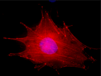 Figura 1: Microscopia de fluorescência de célula de melanoma murino (B16F10-Nex2) fixada, permeabilizada e marcada com DAPI que cora o núcleo em azul e com Faloidina-Rodamina que cora a actina da célula em vermelho