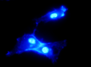 Figura 2: Microscopia de fluorescência de célula B16F10-Nex2 tratada com o peptídeo C7H2 (Arruda et al., 2012) e marcada com Hoechst 33342 que intercala nos sulcos menores do DNA. O peptídeo degrada a membrana nuclear e o DNA é liberado do núcleo, marcando a célula inteira (Arruda et al., 2012).