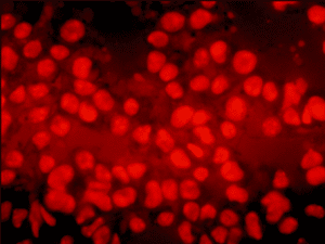 Figura 3:Microscopia de fluorescência de célula B16F10-Nex2 tratada com o peptídeo C7H2 (Arruda et al., 2012) e marcada com DHE, que na presença de espécies reativas de oxigênio, marca o núcleo em vermelho.